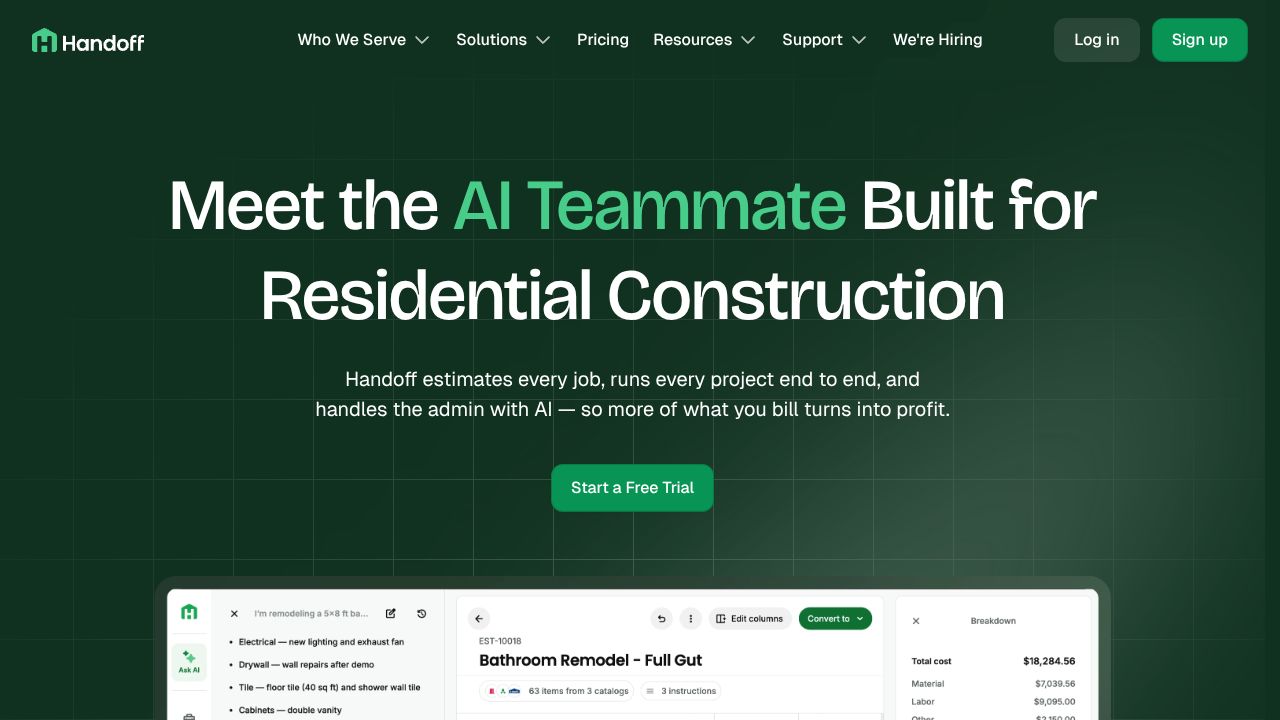 Handoff.AI's architecture is built on a microservices foundation, with distinct services handling estimation, CRM, and financial operations. The system employs a combination of transformer-based language models for document parsing and custom computer vision algorithms for site walkthrough analysis. What's particularly impressive is their implementation of local GPU acceleration for real-time processing of voice memos and PDF inputs.